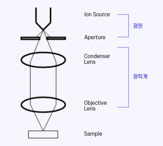 Ion Beam의 경우 동위체 등의 존재에 의해 중량이 다른 Ion이 존재하는 것으로부터 자계를 이용해 집속시킬 수가 없습니다.