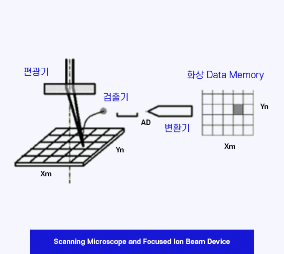 시료 표면에 초점을 맞춘 Beam을 Deflector로 Sample 표면에 주사합니다.