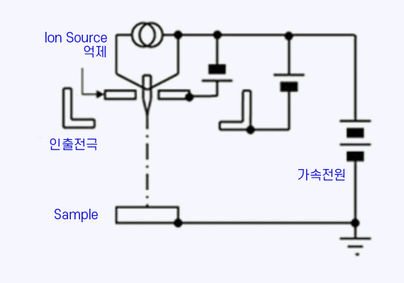 Ion Gun의 경우에는 예리한 금속의 끝부분에 액체 금속 Ga을 흘려 공급해서 전계의 힘으로 방사시킵니다.