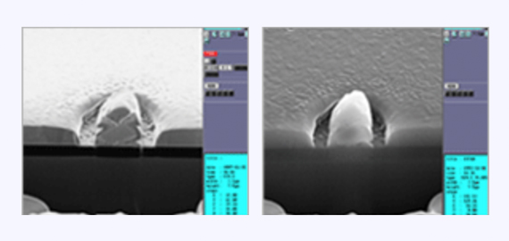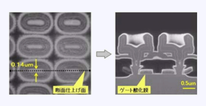 이 기술을 응용해 Sample에 정해진 곳의 Etching을 실시해 단면을 노출시켜 관찰하는 단면 가공관찰이나 Sample의 특정 장소를 박편으로 채취하는 TEM 시료 제작 가공을 실시 할 수가 있습니다.